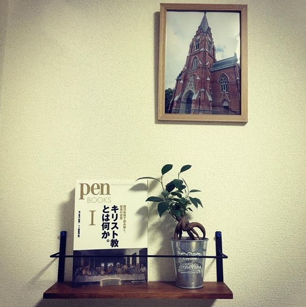 画鋲を使って壁に貼り付けるタイプのラック(購入時は1728円)を使って、『pen BOOKS』(CCCメディアハウス刊)を飾ってみました。