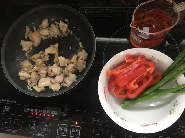 水にサフランで色をつけたり、アスパラを塩茹でしたり、パプリカを切ったり、鶏と米を炒めたりしたら下ごしらえは終わり。