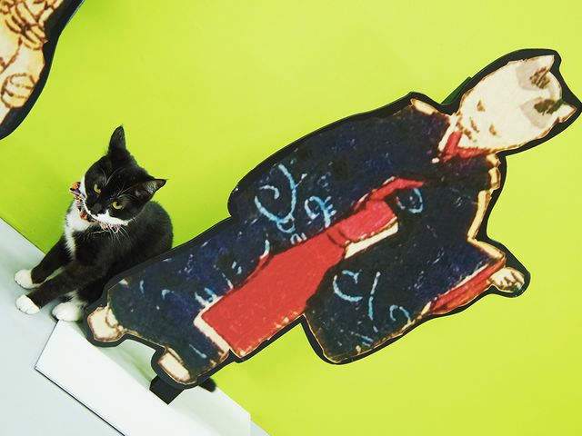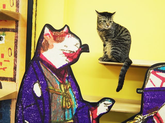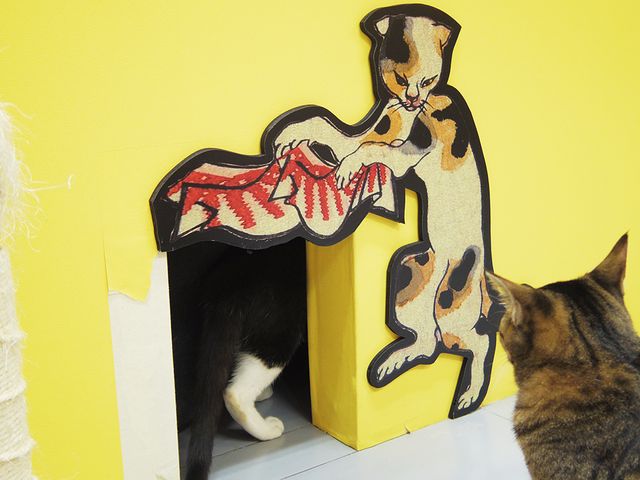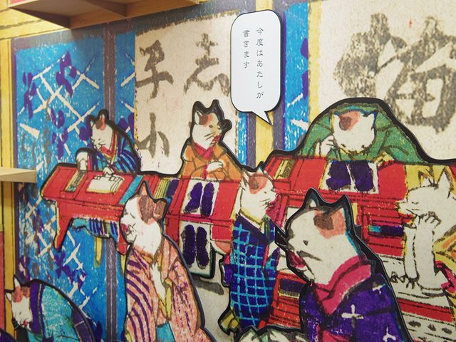 浮世絵のパネルがいたるところに立っていて、絵と本物の猫のコラボが楽しめます。