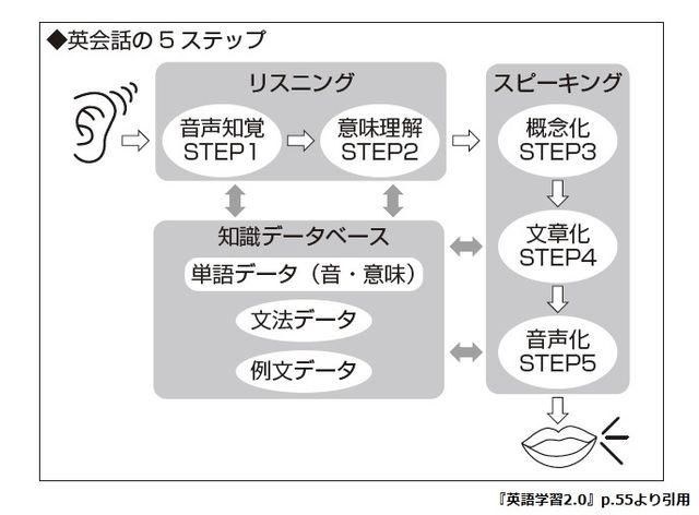 本書では「英会話の5ステップ」として、英会話をしているときの人間の脳の働きを科学的に5つのステップに分解している。この5つのステップはリスニングとスピーキングの2つのグループに分けられ、リスニングは「音声知覚」と「意味理解」の2つのステップ、スピーキングは「概念化」「文章化」「音声化」の3つのステップとなる。