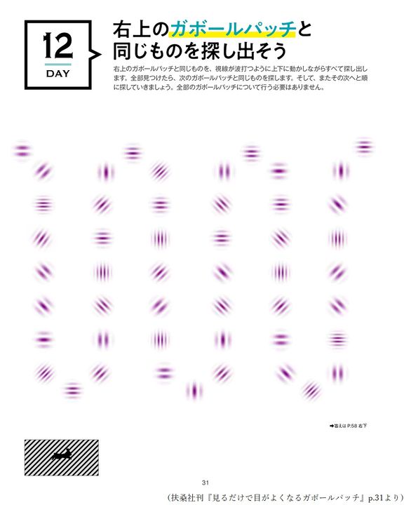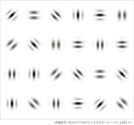 これは、「ガボールパッチ」と呼ばれるぼやけた棒線模様が無数に並べられたシートの中から、同じ角度、本数の模様を探すというトレーニング法。脳の視覚野を刺激して、その解像度を高める可能性があるといわれ、「脳内視力」の向上が期待できるといいます。